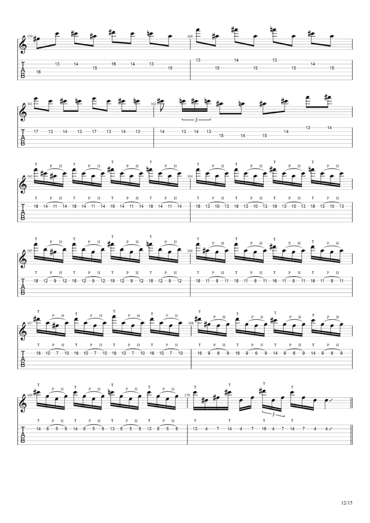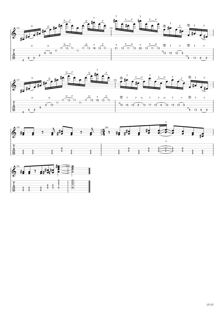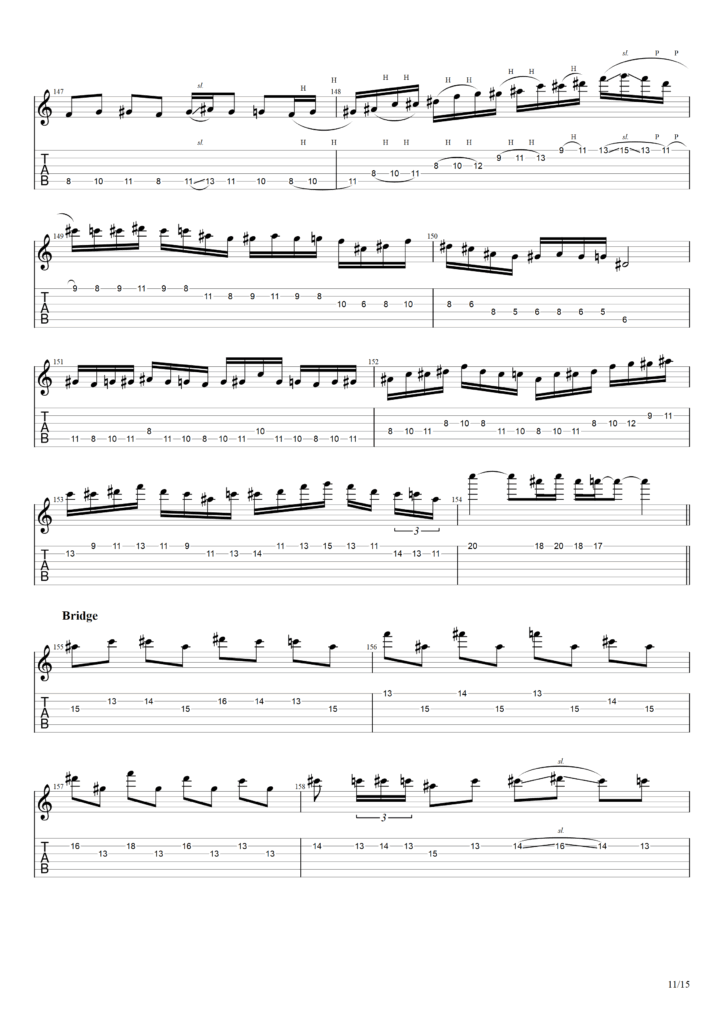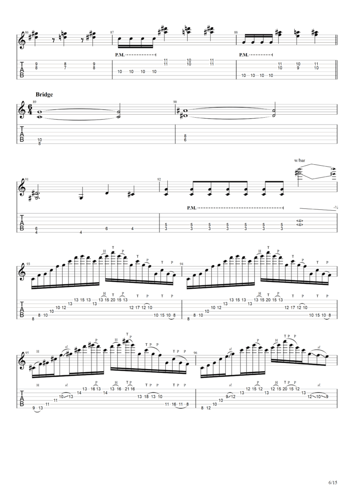 なお筆者の弾いたものに近い+こう弾きたかったけど映像の段階では弾けてない部分もTAB譜にて書いていますので予めご了承ください。